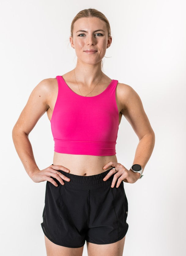 The Mel bra is the new addition with high impact support, has removable pads and double strap on both sides at the back with extra length on the band, excellent support under the arms and upper chest with a high neck.